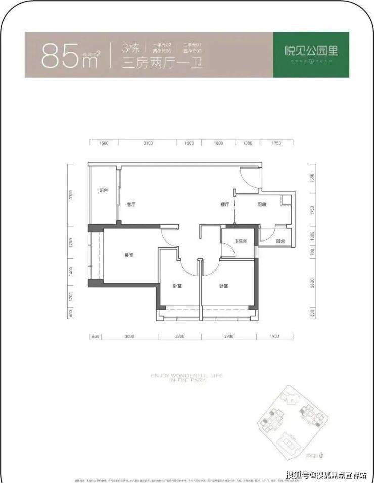 85㎡的3房2厅1卫,设计的是竖厅格局,客厅3.3米开间,LDKB一体化设计,3个卧室分别做到了3.1米/2.9米/2.3米的宽度,L型厨房带1个生活阳台,卫生间三段式分离,得房率73.72%(不含赠送),西北或东南朝向。