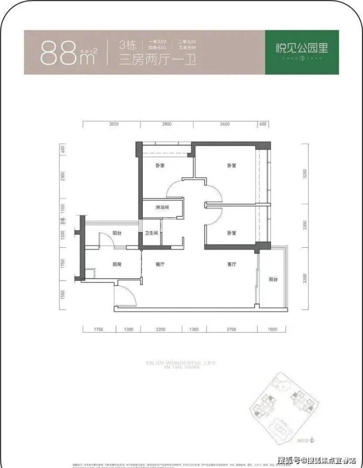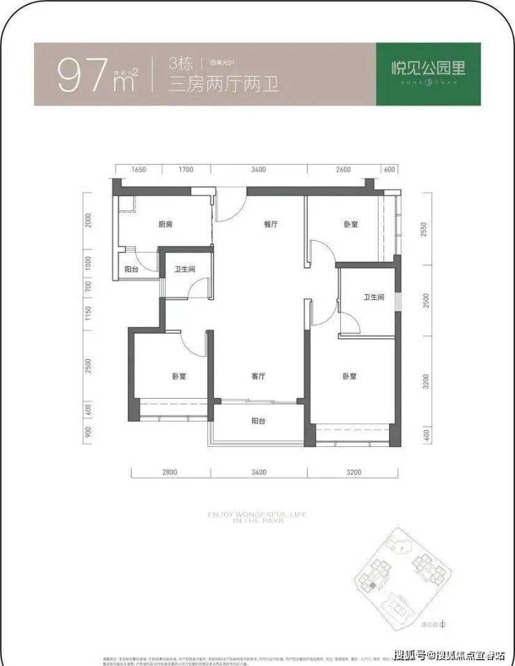 97㎡的3房2厅2卫,仅3栋4单元01户型,设计的是竖厅双龙抱珠格局,客厅3.4米开间,三开间朝南,3个卧室分别做到了3.2米/2.8米/255米的宽度,L型厨房带1个生活阳台,公卫三段式分离,得房率73.61%(不含赠送),东南朝向。