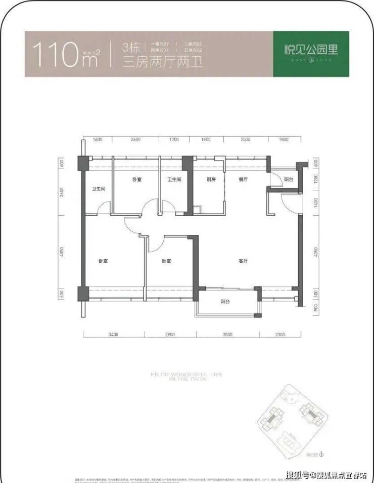 110㎡的3房2厅2卫,设计的是横厅大开间格局,客厅5.8米开间,南北通透双阳台,三开间朝南,3个卧室分别做到了3.4米/2.9米/2.6米的宽度,U型厨房,公卫三段式分离,得房率73.71%(不含赠送),阳台主朝西南或东南向。
