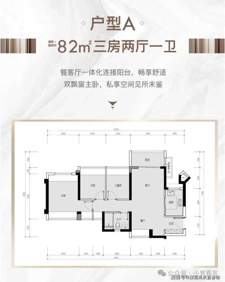 82㎡的3房2厅1卫(户型A),1栋/3栋1单元的05户型,设计的是竖厅南北通透格局,进门入户玄关,客厅3.3米开间,LDKB一体化设计,3个卧室分别做到了3米/2.55米/2.35米的宽度,主卧双飘窗南北通设计,U型厨房,得房率:77.51%(不含赠送),阳台主朝东北向。