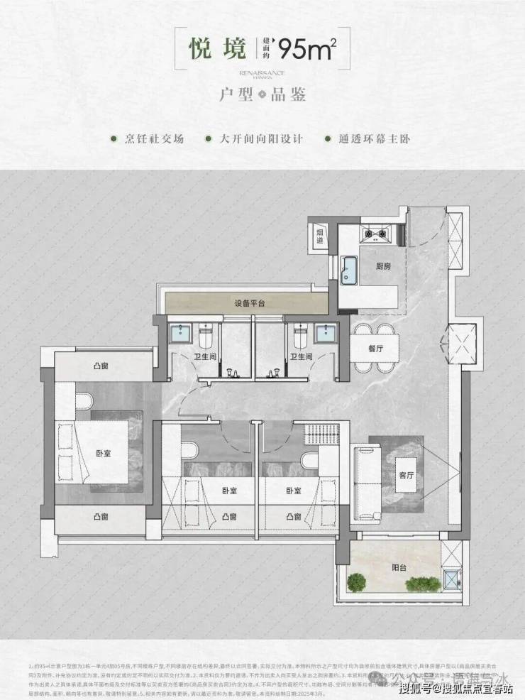 95㎡的3房2厅2卫,设计的是经典竖厅格局,进门入户玄关,LDKB一体化,S墙设计预留冰箱卡槽位,四开间朝南,U型厨房,卫生间干湿分离,还带1个超大设备平台,得房率约95.47%(包含赠送),东北朝向。
