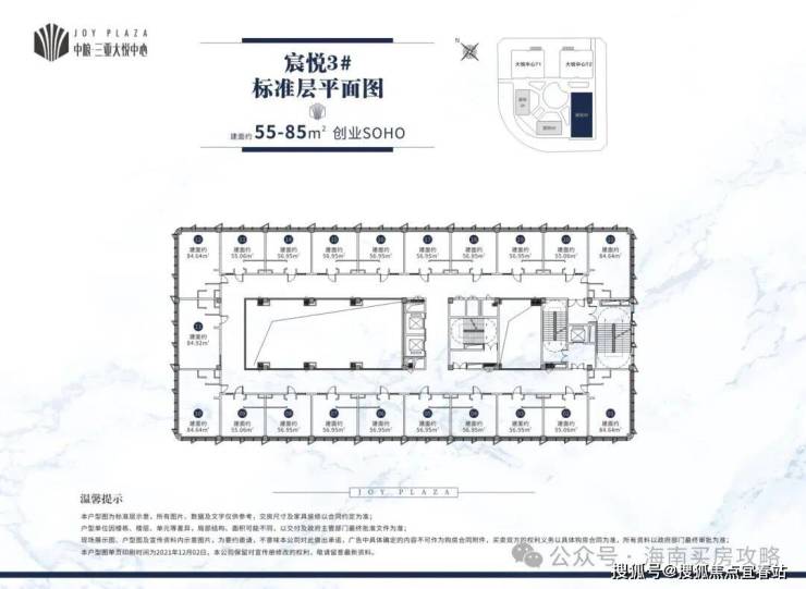 宸悦3#,创业SOHO,建筑面积(除底商)约7900㎡,总高7层,3梯21户,标准层高4.5米。