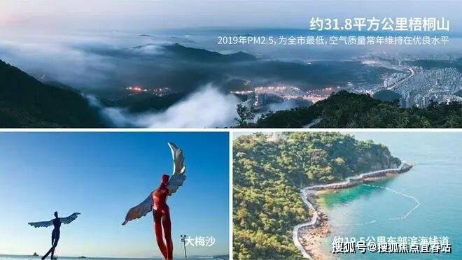 这是项目最大的亮点之一。梧桐山就在家门口,31.8平方公里,森林覆盖率88%,负氧离子全市最高,PM2.5全市最低。项目与梧桐山接壤,向西可以俯瞰深圳市区,向南与香港大雾山对峙,东南方向能看大鹏湾海面和大鹏半岛。