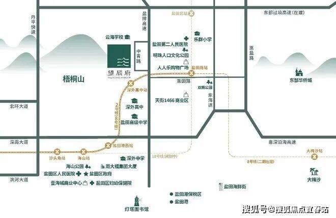 望辰府位于盐田港片区,中青路半山溪谷花园西侧,梧桐山半山腰上。这个位置,属于盐田港全新开发的区域,附近楼盘基本都是2015年后新建的,城市界面相当新。