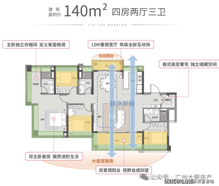 140平四房三卫,不超豪宅线做四房三卫,挺不错的。只在8#楼小高层,专梯入户。南北双阳台,格局和123平很像,可以看作125平户型的升级版。