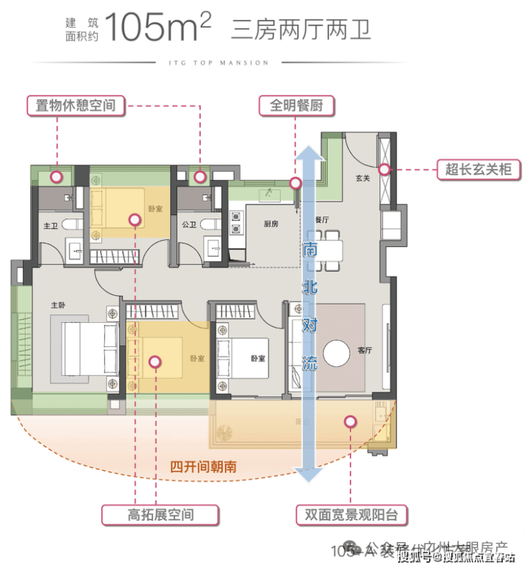 105平做四房,布局和85平相似,也是四开间朝南,阳台连通客厅与次卧,不同的是,北向有个卧室夹在公卫与主卫中间。