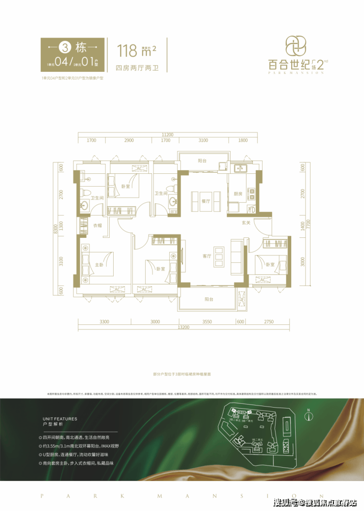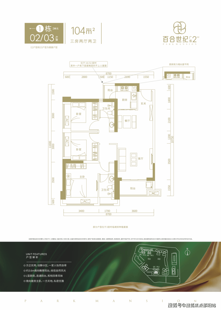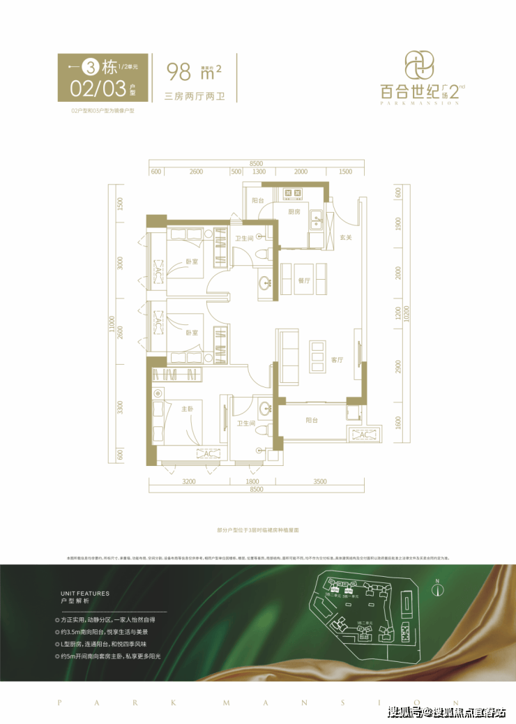 百合世纪广场二期(B-02地块),总占地面积约3.6万㎡,总建筑面积约27.03万㎡,计容建筑面积约19.38万㎡,共由3栋7个单元组成,总高是31-48层的住宅,其中1栋1单元住宅42F,1栋2单元住宅47F,2栋1单元住宅46F,2栋4/5单元住宅48F,3栋1/2单元住宅31F,另外2栋2单元公寓30F,2栋3单元商务办公楼22F,4栋是1所九班制幼儿园。