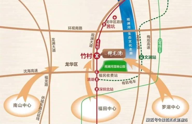 地铁4号线竹村站上盖,商业MALL直连,停车场直连地铁出入口,7站速达深圳北、13站钟直达福田中心,对接深港生活圈;电车文澜站,直线距离约500米,地铁22号线(在建中)。