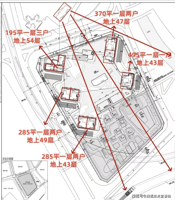 网传将建5栋43-54层(地下2层),最宽楼间距约87米,预计400多套供应,一期(住宅)车位地上69个,地下869个。