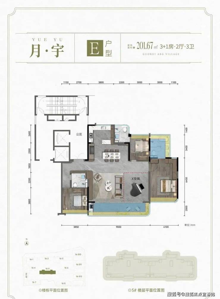 E户型: 建面约201.67㎡ 3+1房2厅3卫