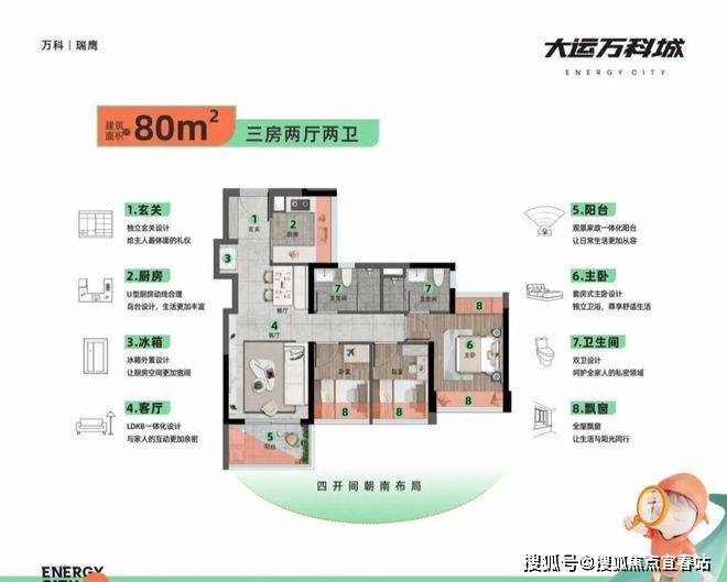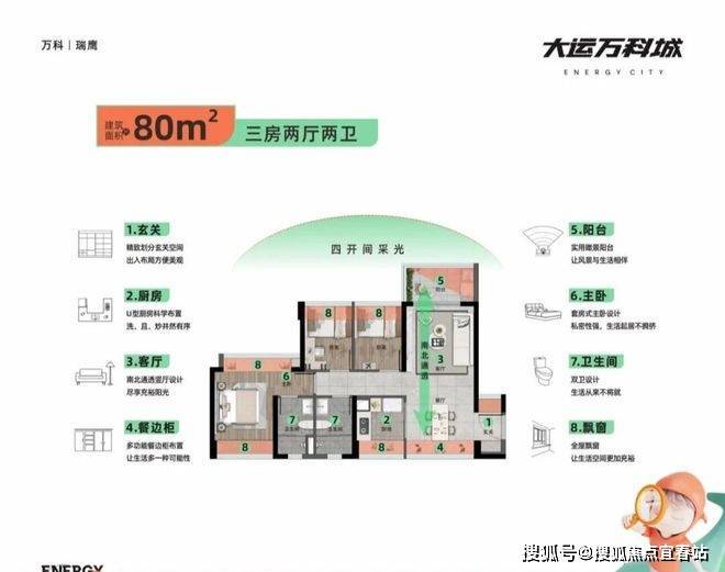 约80㎡三房两厅两卫,超高使用率湖景洋房实际使用率约94-98%