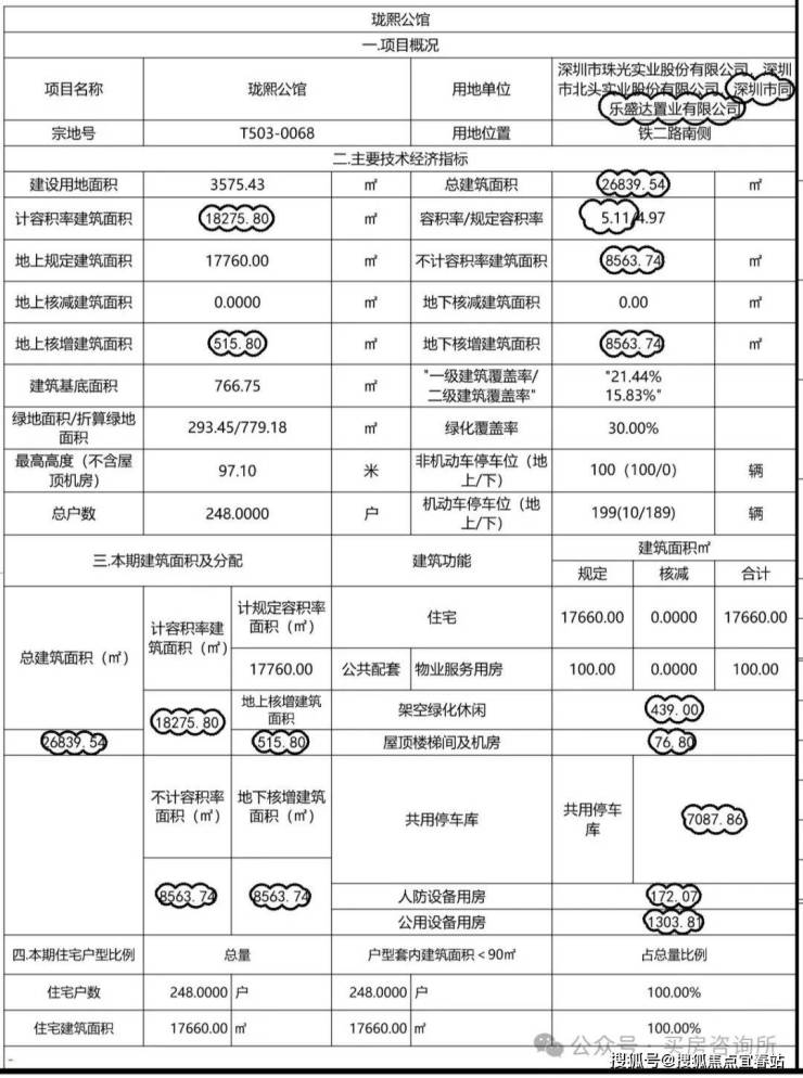 项目建设用地3581㎡,计容面积17760㎡,住宅户数248户,可售161户,回迁87户;项目为单体楼,总高32层,停车位199个。