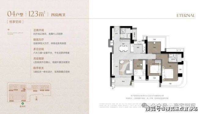 123m²的4房2厅2卫,竖厅格局,客厅4.2米开间,LDKB一体化弹性大方厅,S墙设计预留冰箱卡槽位,四开间朝南,动静分区,主卧套房270°环幕凸窗,六大凸窗+设备平台,U型厨房,卫生间干湿分离。阳台正南朝向看皇岗公园,得房率76%(不含赠送,套内面积93.94㎡)。