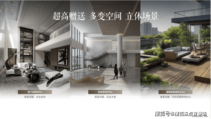 超高赠送、多变空间,酒店式独立专梯首层约9米层高大堂,尽显尊崇企业风范负一层约7米层高专属空间,电梯直达,可自由改造艺术展厅、阶梯路演等约4.5米天台花园,具备顶层酒会、宴会沙龙、户外泡池等多元需求