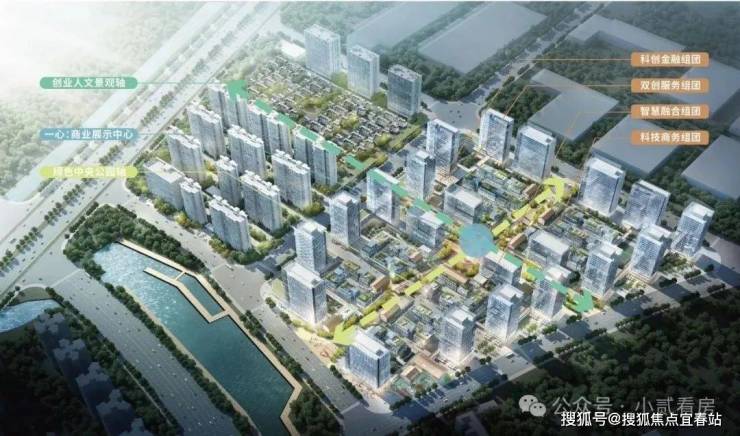 一心、两轴、四组团:一心是指:商业展示中心;两轴是指:绿色中央公园轴、创业人文景观轴;四组团是指:双创服务组团、科创金融组团、智慧融合组团、科技商务组团;