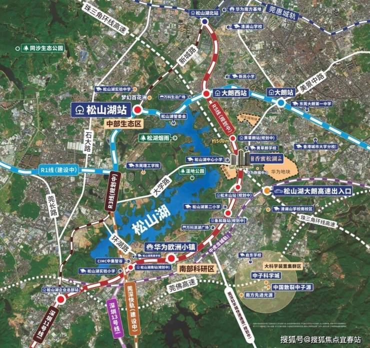 轨道交通:地铁1号线(在建中)、5号线(规划中,途径项目旁黄草朗站),莞惠城轨三线交汇,无缝链接主城区与大湾区。🚝自项目旁环湖路(约200米)出发,即可到到达科学城快速通道起点,约12km直达光明科学城。