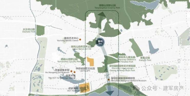 中心区域:深圳山海城中轴,左手香蜜湖、右手华侨城,六大总部基地环伺