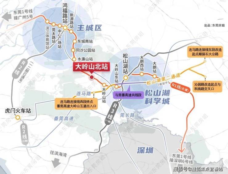 轨道交通:项目位于松湖片区与城区片区交界处,紧邻大岭山北站TOD统筹规划区。该区域是万科在R1线上的第四座TOD项目,具有极高的交通战略价值。项目出小区门口即可步行至R1线大岭山北站(建设中),未来可实现1站东城、3站松湖、5站国贸的便捷出行。此外,松山湖第二通道(规划中)的建成将进一步缩短项目与鸿福路商圈、松山湖万象汇等核心商圈的距离。