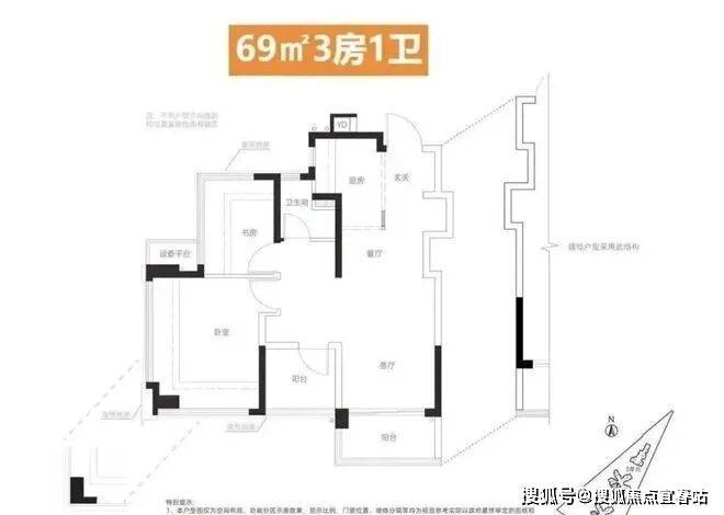 建面约69㎡ 2+1房1卫:该户型实现了三开间朝南,采用LDKG+X一体化设计及S墙冰箱位,空间利用极致,是刚需上车红山的超性价比户型。