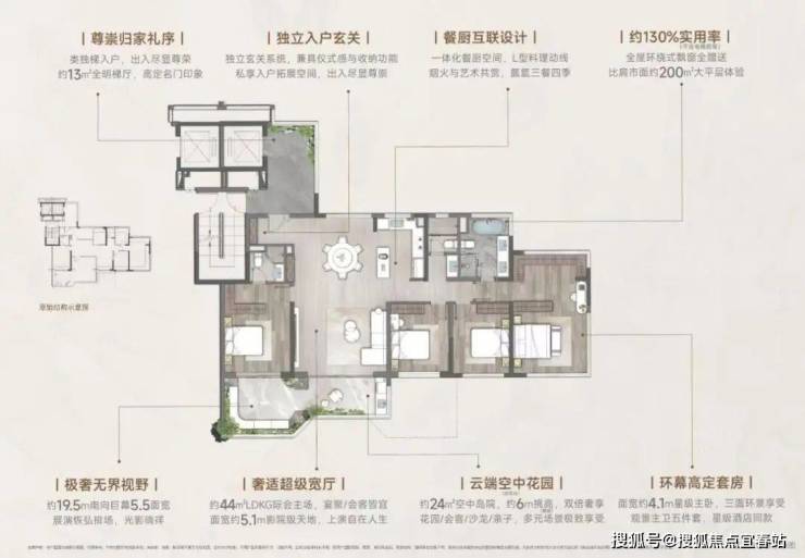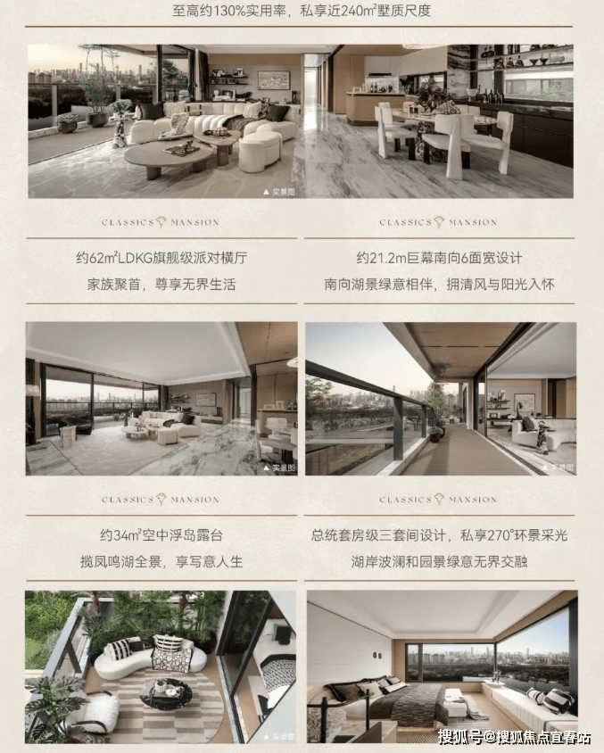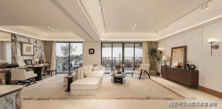 以约44㎡无界宽厅划写天际线,约19.5米环幕视界打破空间桎梏。奢适主卧套间三面环景,270°环幕飘窗私藏四时光影,以约139㎡空间容器承载约200㎡奢居想象。