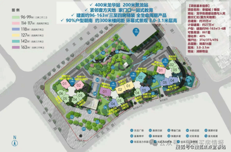 01-01地块占地约1.93万平方米,总建筑面积约23.8万平方米,容积率为8.81,绿化率为40.01%。该地块由1栋40层的办公单元和4栋56层的住宅单元,还规划有公交首末站。地块总规划980户,住宅单元设计为3梯4户、3梯5户和3梯6户,规划停车位1533个。