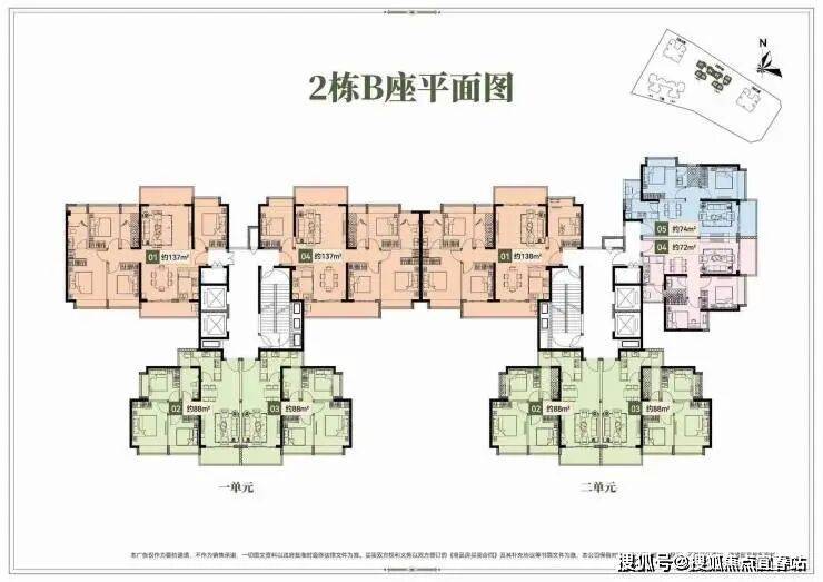 🔹2栋B座一单元01、04户型、2栋B座二单元01户型:面积约为137-138㎡的4房2厅2卫;
