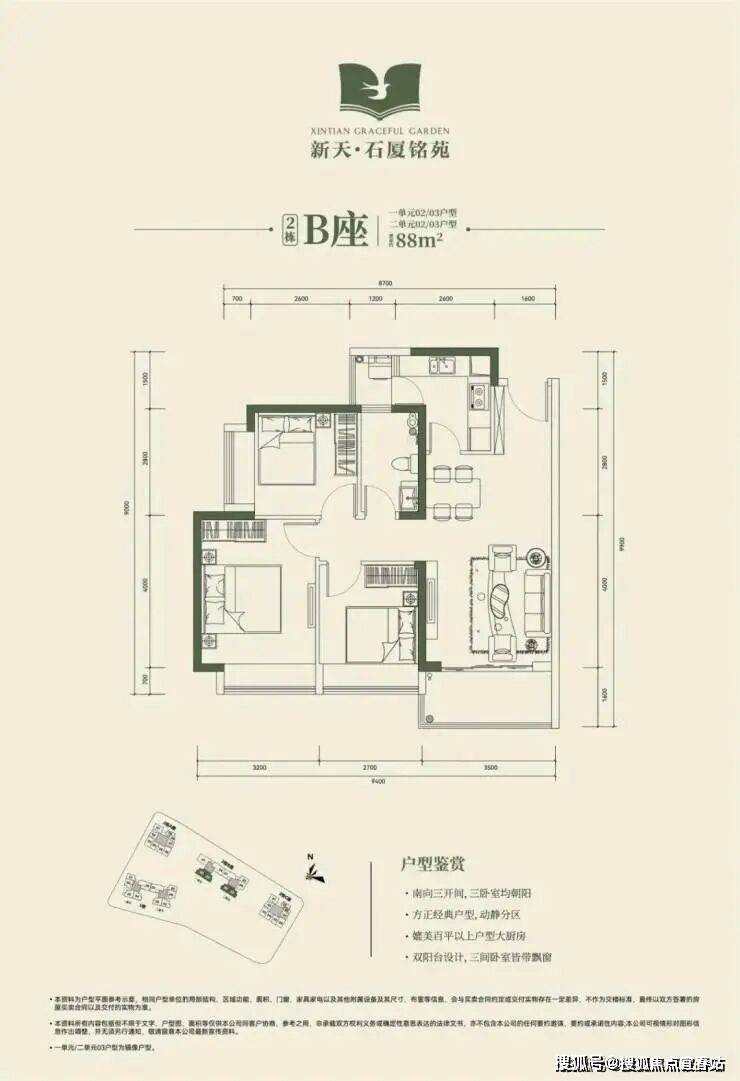 🔸2栋B座一单元02、03户型、2栋B座二单元02、03户型:面积约为88㎡的3房2厅2卫;
