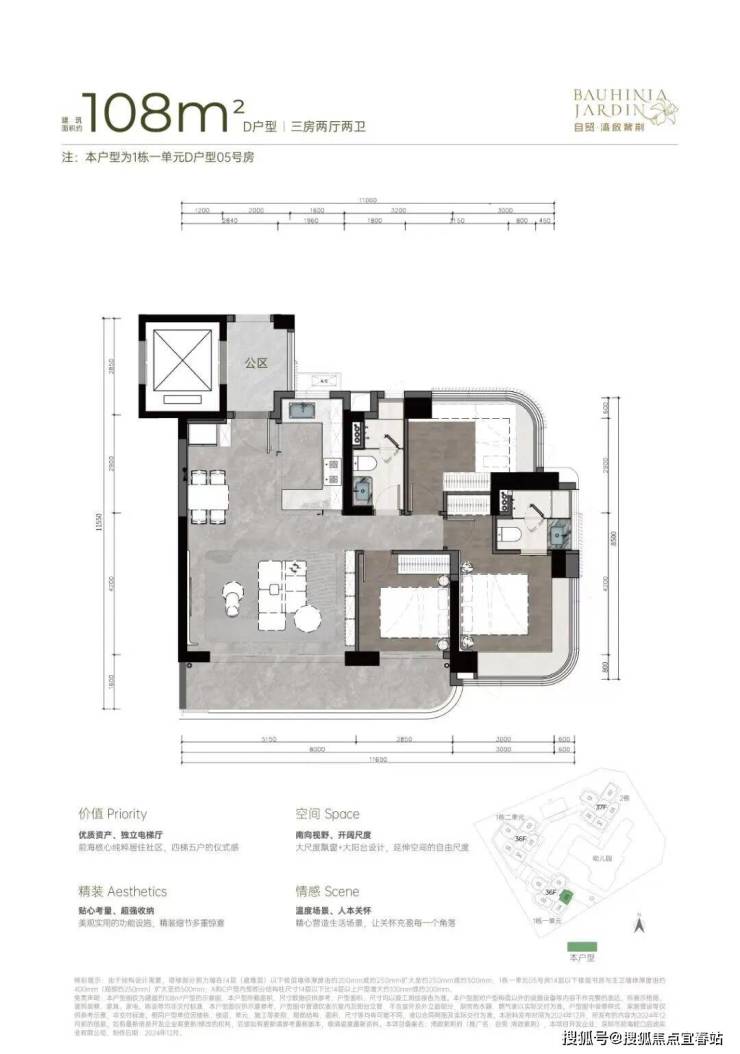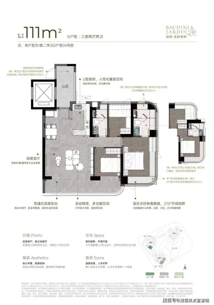 108-111㎡的3房2厅2卫,设计的是竖厅格局,客厅5.15米开间,超宽客厅,LDKB一体化设计,动静分区,三开间朝南,主卧大套间无柱弧形270°转角飘窗,客厅连接次卧出大阳台,U型厨房,卫生间干湿分离,得房率约92-100%(包含赠送),西南或东南朝向。