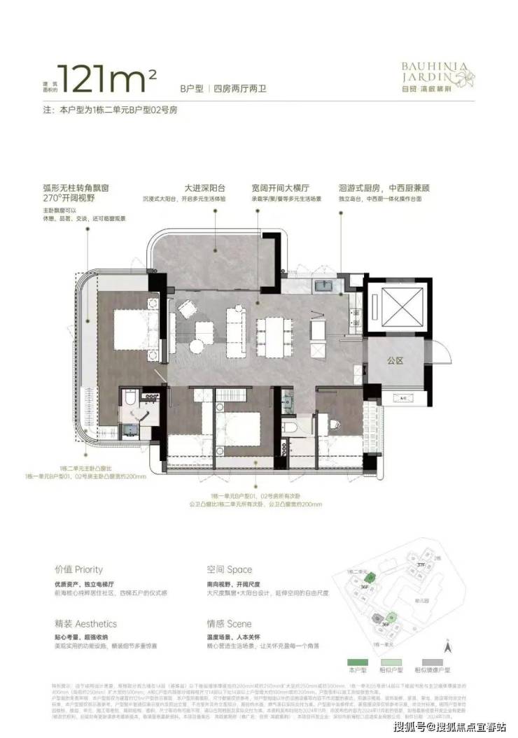 121㎡的4房2厅2卫,设计的是横厅南北通透格局,专梯入户有独立公区,客餐厅7.15米开间,LDKB一体化设计,动静分区,主卧大套间无柱弧形270°转角飘窗,客厅大进深阳台,洄游式中西厨房,公卫三段式分离,得房率约92-100%(包含赠送),阳台主朝西南或东南向。