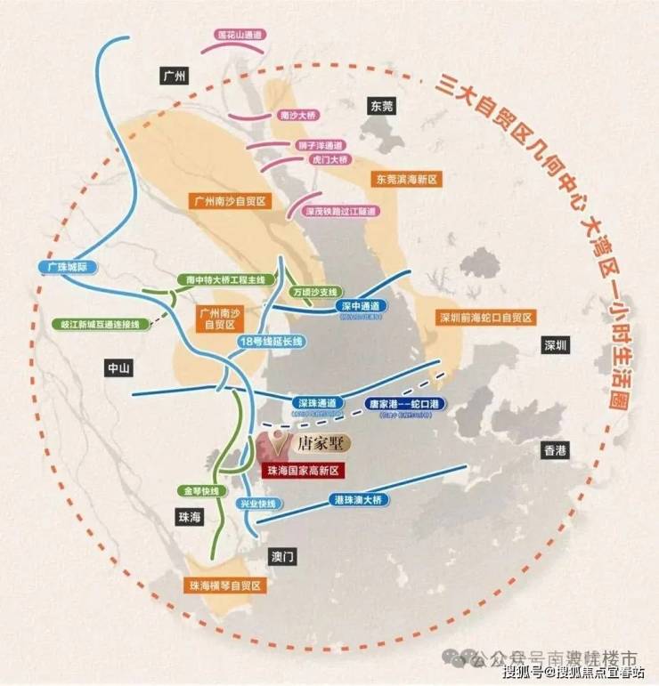 4. 深珠通道接驳处,与深圳前海仅一桥之隔,深中通道、18号轻轨延长线等交通路网,实现珠海横琴自贸区、广州南沙自贸区和深圳前海蛇口自贸区三大自贸区几何中心构建大湾区一小时生活圈