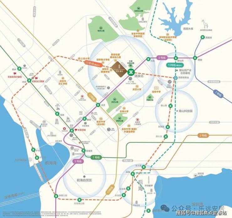 临靠5号线洪浪北地铁站D出口,向南3站到达宝安中心站,6站到达前海湾站,向北2站到达留仙洞总部基地,7站到达深圳北站;15号线(规划中),联通大铲湾、南山西丽和科技园片区。