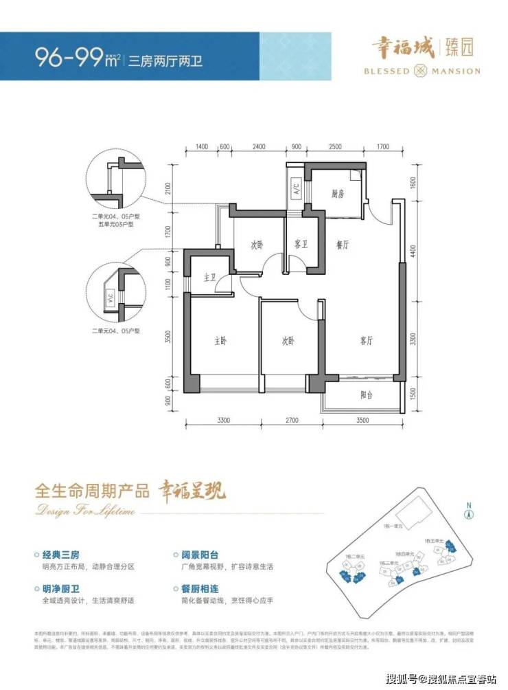 96-99㎡的3房2厅2卫,设计的是经典竖厅格局,客厅3.5米开间,LDKB一体化设计,U型厨房,卫生间干湿分离,得房率75.9%(不含赠送),东南/西南或东北朝向。套内面积72.98㎡+赠送面积7.24㎡=实得面积80.22㎡,加上赠送后实际得房率约83.4%。