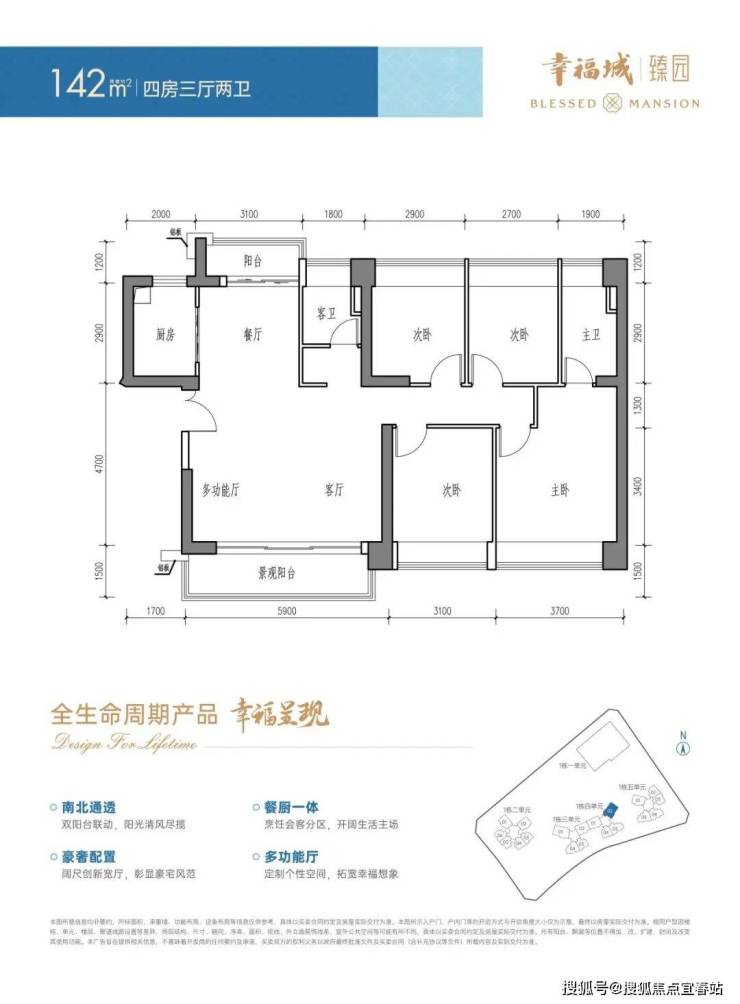 142㎡的4房3厅2卫,设计的是横厅南北通透格局,客厅5.9米开间,餐厨一体化设计,南北双阳台,全屋6个飘窗面,客厅出8.85㎡的观景大阳台,U型厨房,公卫三段式分离,得房率约75.3%(不含赠送),阳台主朝东南向。套内面积106.89㎡+赠送面积15.53㎡=实得面积122.42㎡,加上赠送后实际得房率约86.21%。