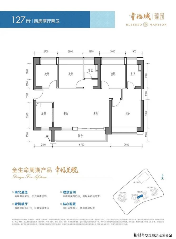 127㎡的4房2厅2卫,设计的是横厅南北通透格局,客餐厅6.7米开间,LDKB一体化设计,全屋6个飘窗面,客餐厅出10.05㎡的大阳台,U型厨房,卫生间干湿分离,得房率75.3%(不含赠送),阳台主朝东南向。套内面积96.39㎡+赠送面积14.02㎡=实得面积110.41㎡,加上赠送后实际得房率约86.23%。