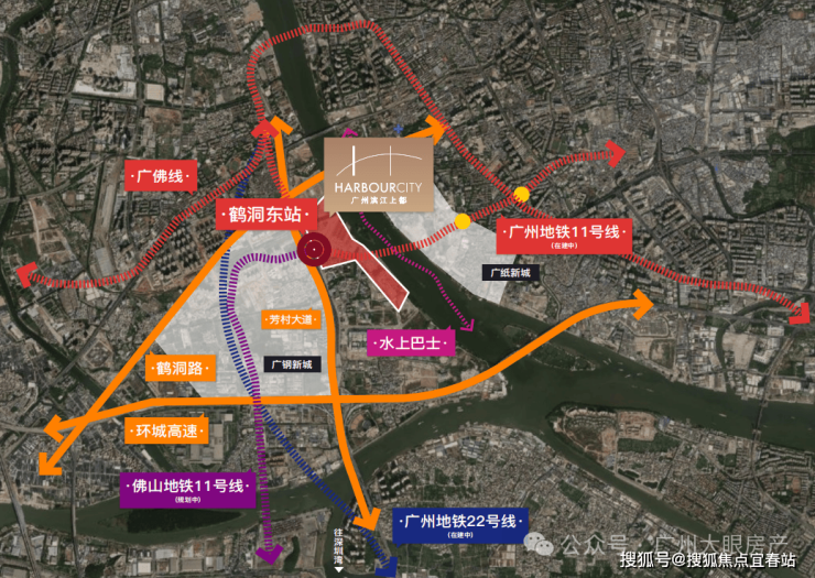 广州11号线鹤洞东站地铁上盖,拥有3横2纵大路网+公交站场+水上巴士,集水、陆、轨等多维交通方式于一体,半小时城央生活圈,1小时湾区生活圈。