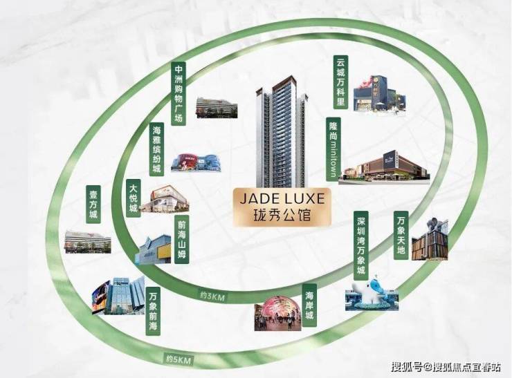 约3-5KM范围内:聚集南山前海山姆、云城万科里、万象前海、万象天地、海岸城、深圳湾万象城等高端及旗舰商业;以及宝中海雅缤纷城、大悦城、中洲购物广场等潮流商业MALL;