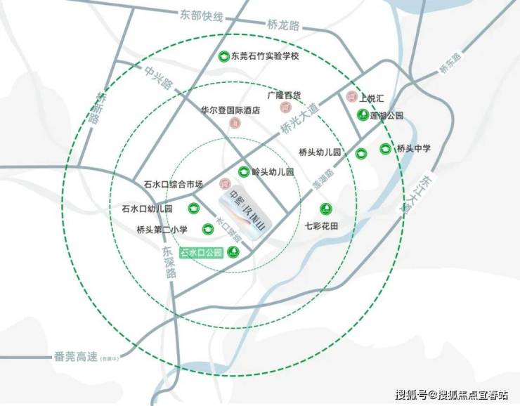 三轨道:桥头坐拥R3、R17、惠州5号线延长线(规划中),三轨交融,串联东莞三大核心发展极,纵横莞惠两地,其中项目距离R3线大东路(规划)仅3公里。