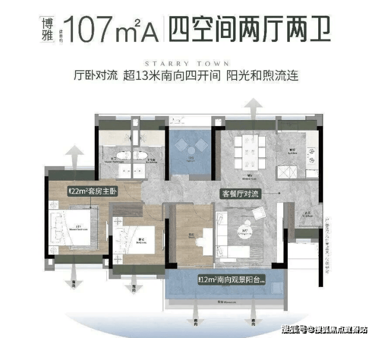 【107㎡A 4空间2厅2卫】 配置南向观景玄关,仪式感入户。 4.5 开间朝南,客厅主卧双南北对流。畅享双面宽观景阳台,飘窗拓宽功能空间。交互式方厅,可开可合。