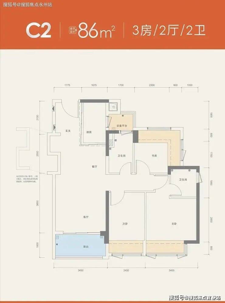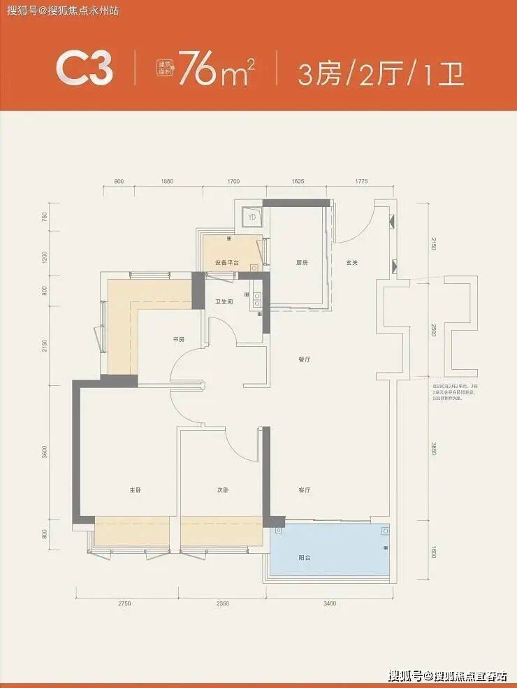 最小户型建面约76㎡三房,实得率高达约98%,尺寸能与新规前85-90平三房户型媲美。LDK一体化设计让客餐厨融为一体,约3.4米的开间让生活空间更显阔绰。所有卧室都额外赠送进深约0.8m的飘窗(远超市场0.6米标准),厨房外设有一个面积约2㎡的设备平台,这些赠送空间往往给生活带来意想不到的便利。