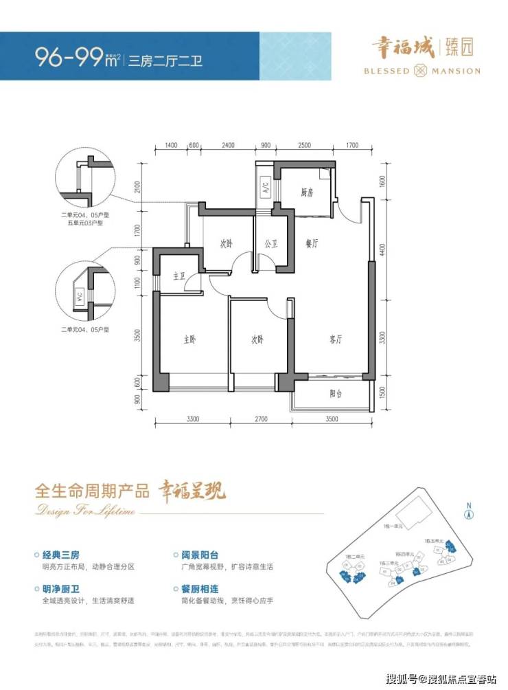 96-99㎡的3房2厅2卫,设计的是经典竖厅格局,客厅3.5米开间,LDKB一体化设计,动静分区,3个卧室分别做到了主卧14.63㎡/次卧11.07㎡/次卧7.26㎡(包含墙体飘窗),U型厨房,卫生间干湿分离,得房率75.9%(不含赠送),东南/西南或东北朝向。套内面积72.98㎡+赠送面积7.24㎡=实得面积80.22㎡,加上赠送后实际得房率约83.4%。