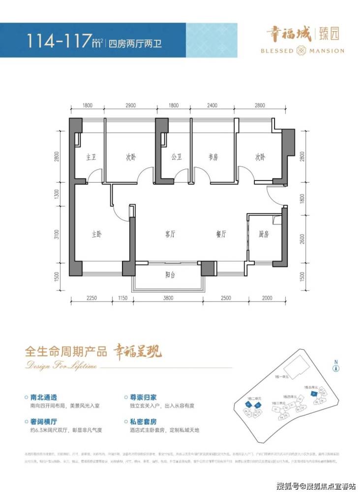 114-117㎡的4房2厅2卫,设计的是横厅南北通透格局,进门入户玄关,客餐厅6.3米开间,LDKB一体化设计,全屋8个飘窗面,4个卧室分别做到了主卧15.35㎡/次卧9.86㎡/次卧9.4㎡/次卧8.16㎡(包含墙体飘窗),U型厨房,卫生间干湿分离,得房率75.9%(不含赠送),阳台主朝西南或东南向。套内面积86.47㎡+赠送面积12.06㎡=实得面积98.53㎡,加上赠送后实际得房率约86.45%。