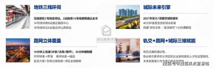 项目自驾10分钟接入水官高速、沈海高速,15分钟接外环高速,通过龙岗大道等主干道快速联通全市,目前已经开通运营的3号地铁线“吉祥站”距离约300米,2站到大运枢纽,可换乘14/16号地铁线,6站到罗湖,7站到福田,以及深大城际2站到五和,5站到石岩,4站到龙城公园站还可以换乘深惠城际线路,4站到深圳北站,5站到南山。
