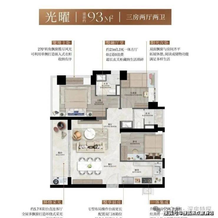 同等户型更到位的功能实用性:全户型U型厨房布局,操作台面更长;双面齐平飘窗可打造嵌入式衣柜或休闲角,空间拓展性强。