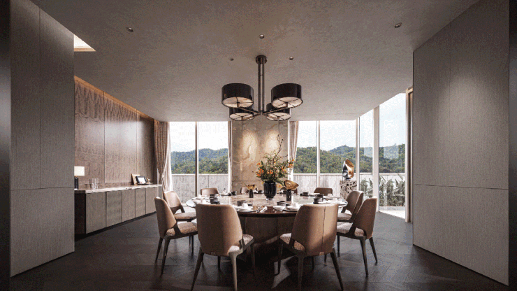 一推门,穿梭在被全面屏包裹住的会客厅,尊享凤凰山无遮挡的独家视野,还有什么设计能比这更好的安放你的情绪呢。