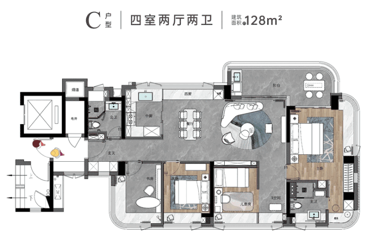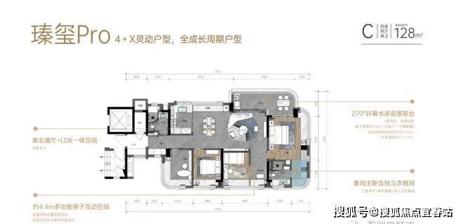 【建面约128㎡的4房2卫】:大横厅设计,西南+东北“双朝向”。