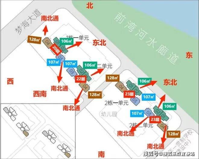 【建面约106㎡的3房2卫】:经典的竖厅设计,朝向东北河岸景观,动静分区。