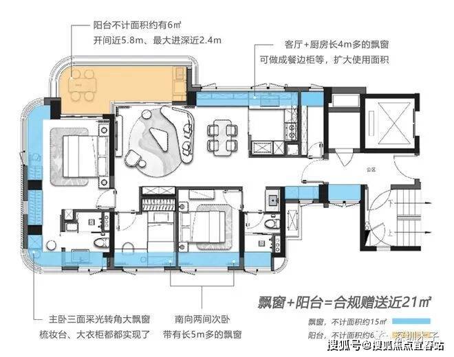 超受欢迎的户型,有巨多飘窗的横厅户型,几乎一整个房子都被飘窗包围。由于飘窗的面积不算在套内,所以这个户型使用率会出奇高。