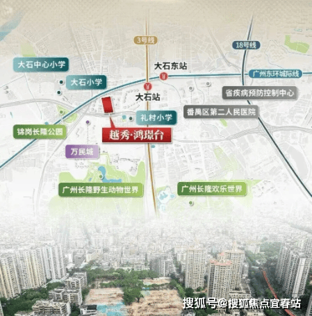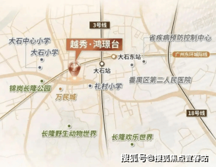 广州越秀鸿璟台坐落于番禺大石核心区域,具体在南大干线北侧,步行约 700 米就能抵达地铁 3 号线大石站,这个位置让通勤变得格外省心,6 站地铁可直达珠江新城,1 站就能到万博 CBD,对在核心商圈上班的年轻人来说很友好。