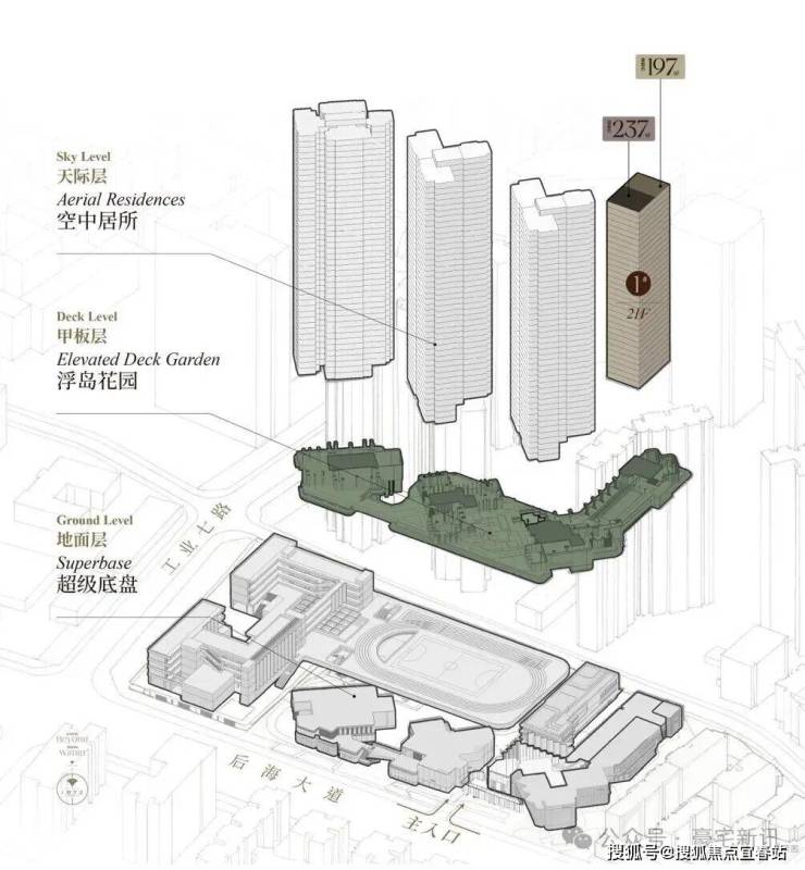 利用裙房屋顶打造拥有“仪式水轴“艺术庭院”“空中浮岛森林”三级景观设计的空中庭院,四栋住宅均漂浮于甲板之上,独享甲板庭院花园,以“海风吹拂下的豪宅底盘”托举城市上空的豪宅群落,形成立体景观系统。