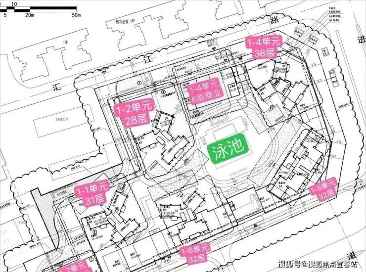 共规划建设7栋楼体,其中5栋为28-38层的高层住宅,共504户,均采用2梯4户或3梯4户的设计,另有1栋6层商业和1栋21层的办公产品,此外,小区内设有泳池配套。